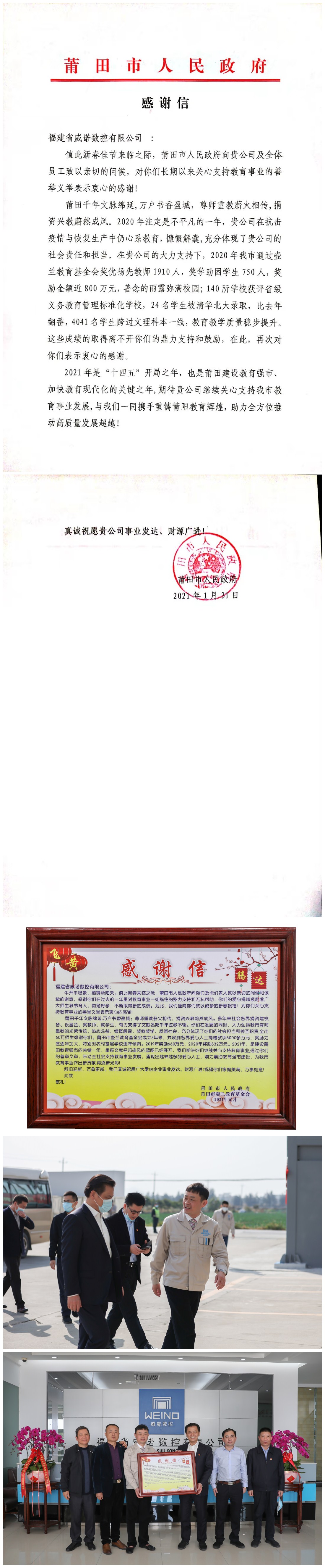 莆田市壺蘭教育基金會領(lǐng)導(dǎo)向我司贈送一封特殊定制的“感謝信”以及預(yù)祝威諾公司新春吉祥,寓意公司蓬勃發(fā)展紅紅火火的一對蝴蝶蘭,并表示值此新春來臨之際,在向威諾公司致以誠摯的新春祝福同時,也非常感謝威諾公司在過去的一年里對教育事業(yè)一如既往的鼎力支持和無私幫助,向威諾公司關(guān)心支持教育事業(yè)的善舉義舉表示衷心的感謝!